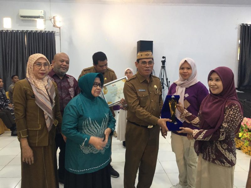 Sekda Iwan Mustapa didampingi Kepala Pusat Analisis Perpustakaan dan Pengembangan Budaya Baca, Nurhadi Saputra serta Bunda Literasi Bone Bolango, Ruwaida Ismet Mile saat menyerahkan bonus dan penghargaan Apresiasi Lomba Perpustakaan Desa/Kelurahan tingkat Kabupaten Bone Bolango di BPU Kabila, Selasa (2/12/2025). (F.Indra/Diskominfo)