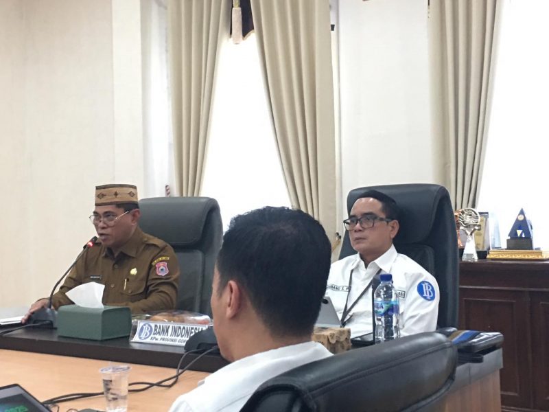 Sekda Iwan Mustapa didampingi Kepala Perwakilan Bank Indonesia Provinsi Gorontalo, Bambang Satya Permana saat memimpin High Level Meeting Tim Pengendalian Inflasi Daerah (TPID) Triwulan IV di Ruang Rapat Bupati, Selasa (2/12/2025). (F.Indra/Diskominfo)