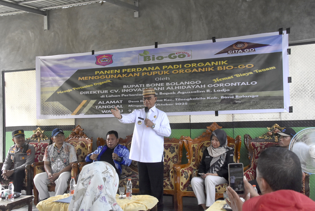 Bupati Bone Bolango, Ismet Mile didampingi Wabup Risman Tolingguhu saat menghadiri memberikan sambutan pada kegiatan panen perdana padi di lahan pertanian milik salah seorang petani di Desa Iloheluma, Kecamatan Tilongkabila, Minggu (26/10/2025). (F.AKP-Diskominfo)