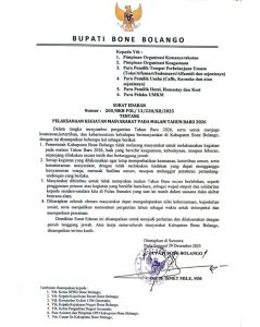 Suwawa, Berita – Pemerintah Kabupaten Bone Bolango menerbitkan Surat Edaran Bupati Nomor 200/BKB-POL/13/228/XII/2025 tentang Pelaksanaan Kegiatan Masyarakat pada Malam Tahun Baru 2026. Surat edaran ini dikeluarkan dalam rangka menjaga keamanan, ketertiban, serta keharmonisan kehidupan bermasyarakat menjelang pergantian tahun di Kabupaten Bone Bolango.