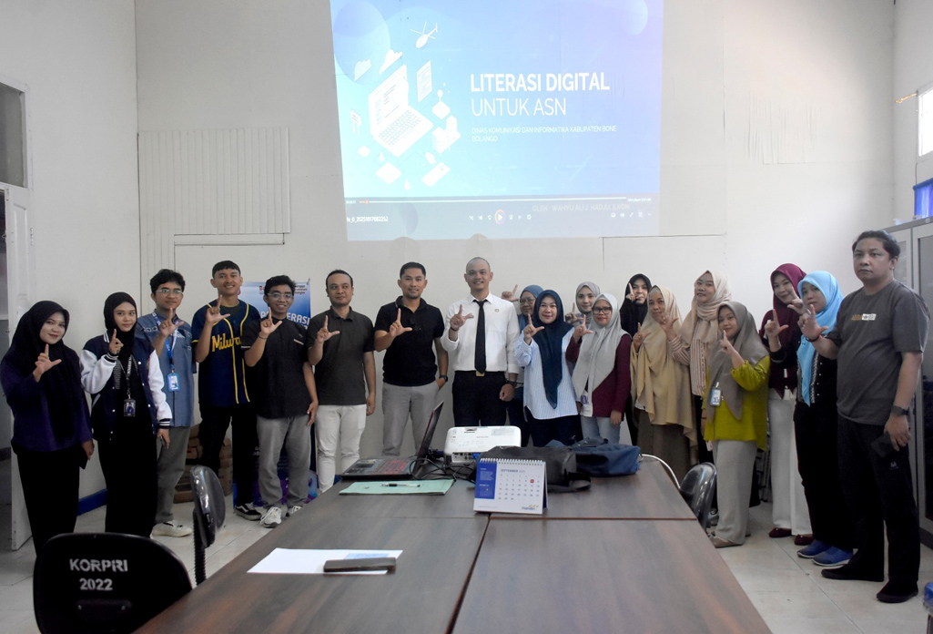 Pengendali Konten Internet Diskominfo Bone Bolango, Wahyu Ali J. Hadju, saat berpose bersama usai mensosialisasikan akan pentingnya literasi digital bagi ASN dalam mendukung tata kelola pemerintahan modern, di Kantor Dinas Kominfo, Jumat (17/10/2025). Dimana sosialisasi ini adalah bagian dari aktualisasi dari kegiatan Latsar CPNS yang ia ikuti. (F. AKP-Diskominfo)