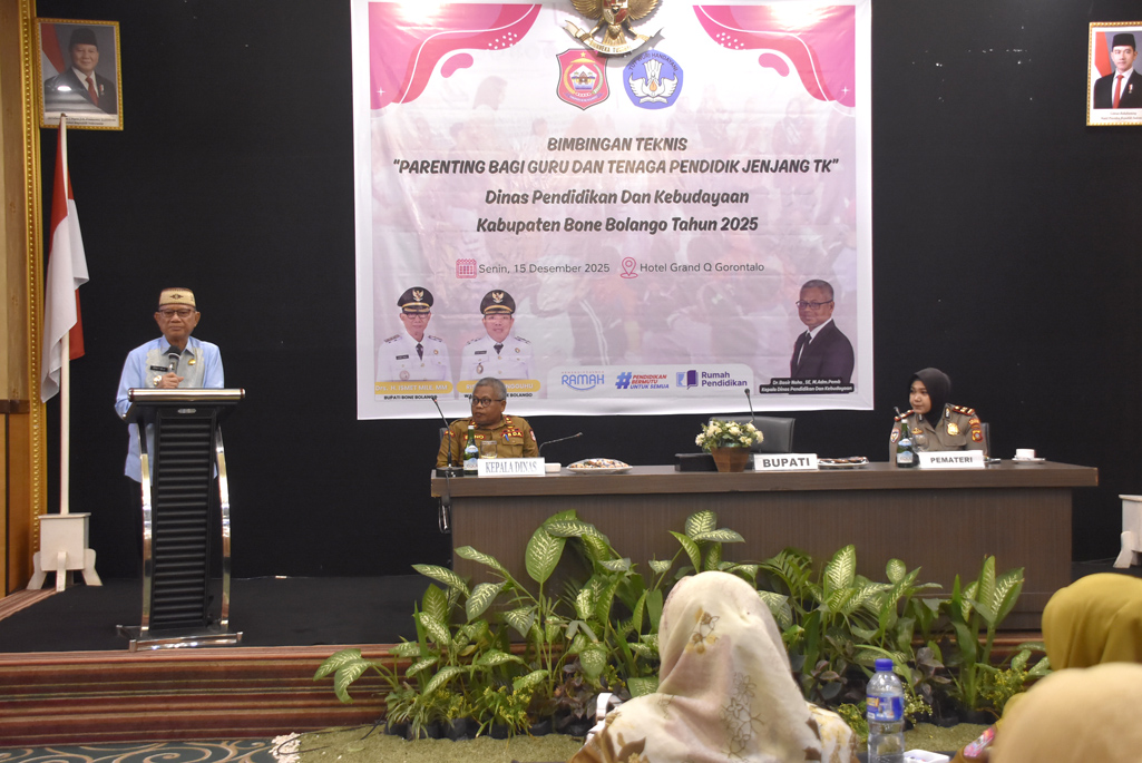 Kota Gorontalo, Berita – Pemerintah Kabupaten Bone Bolango memperkuat komitmen dalam meningkatkan mutu pendidikan, khususnya pada jenjang pendidikan usia dini. Hal ini ditegaskan Bupati Bone Bolango, Ismet Mile saat membuka Bimbingan Teknis Parenting bagi Guru dan Tenaga Pendidik TK se-Kabupaten Bone Bolango, di Grand Q Hotel Kota Gorontalo, Senin (15/12/2025).