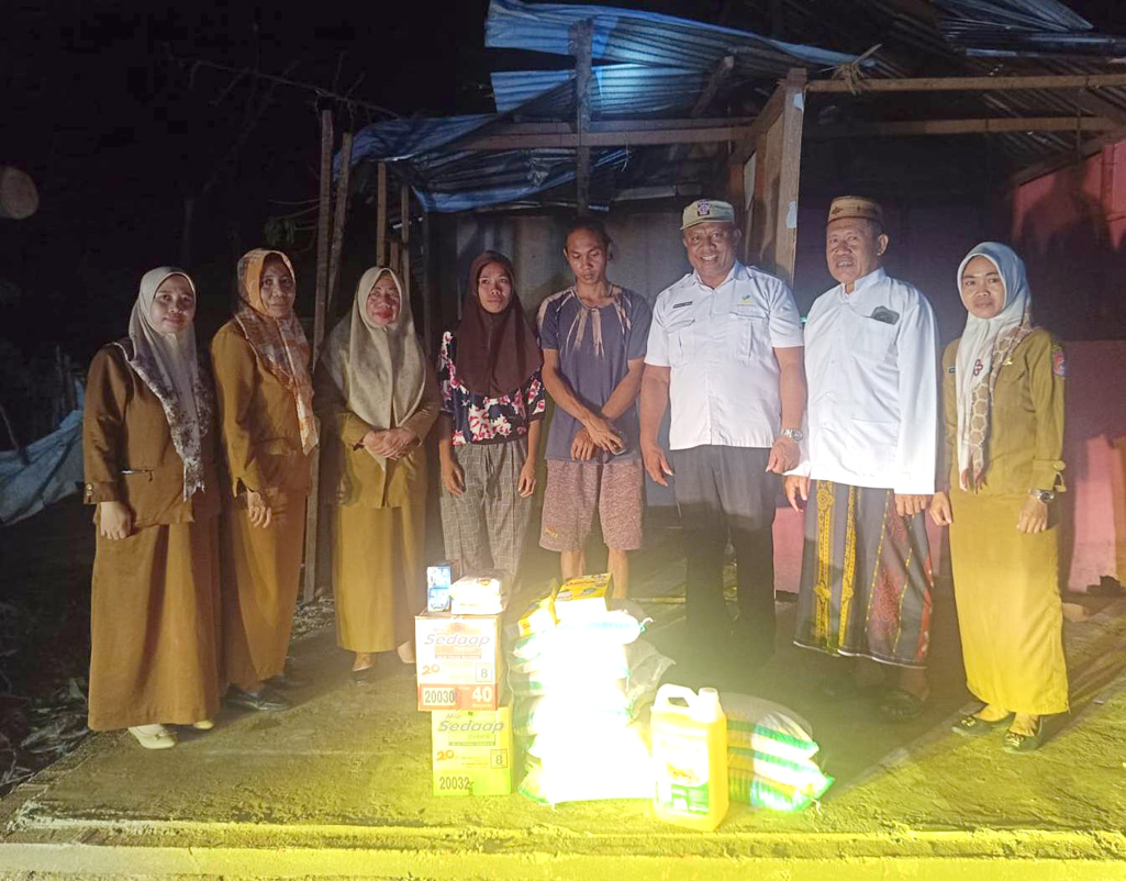 Penyaluran bantuan kepada keluarga yang rumahnya tertimpa pohon tumbang di Dusun Abati, Desa Modelomo Kecamatan Kabila Bone, oleh Kepala Dinas Sosial dan P3APPKB Bone Bolango, Samsia Melu yang turut didampingi Kabid Pemberdayaan Sosial, Reinhard Uruilal, Selasa (18/11/2025) malam. (F.dok. Dinas Sosial)