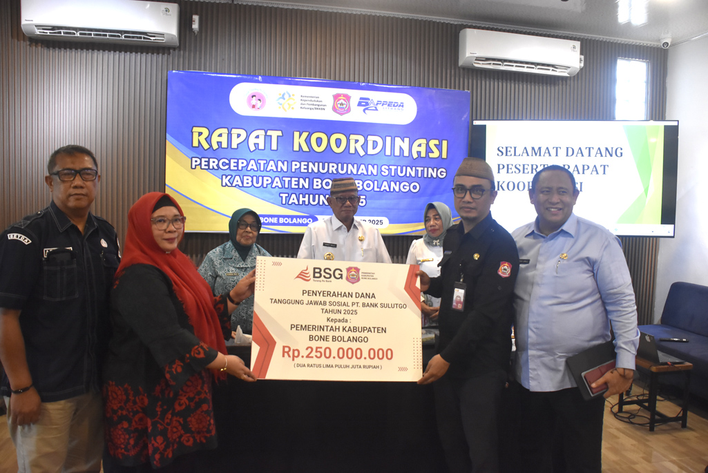 Branch Manager PT. Bank SulutGo Kantor Cabang Suwawa, Sri Wahyuni Wantogia menyerahkan Dana CSR kepada Plt. Kepala Dinas Pemberdayaan Masyarakat dan Desa (Pemdes) Bone Bolango Nixon Adolong, yang disaksikan langsung Bupati Bone Bolango, Ismet Mile disela-sela Rapat Koordinasi Percepatan Penurunan Stunting Kabupaten Bone Bolango, di Naffil Resto & Cafe, Kamis (13/11/2025). (F.AKP-Diskominfo)