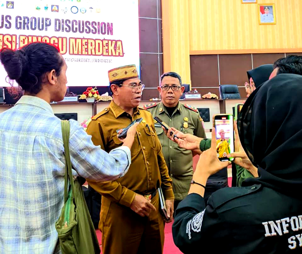 Sekda Bone Bolango, Iwan Mustapa saat menghadiri Focus Group Discussion (FGD) Aliansi Pinogu Merdeka, di Auditorium DPRD Bone Bolango, Senin (6/10/2025). (F. Azizah//Magang Diskominfo)