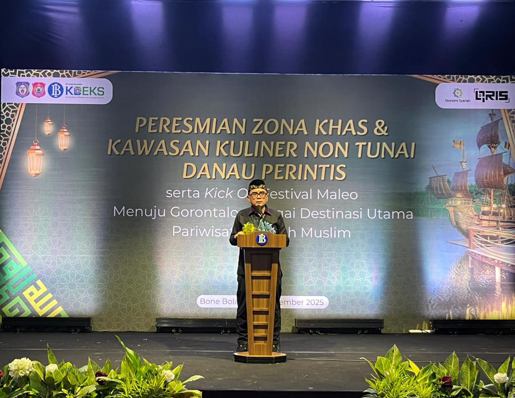 Kepala Bank Indonesia (BI) Perwakilan Provinsi Gorontalo, Bambang Satya Permana saat memberikan sambutan pada peresmian Zona Kuliner Halal, Aman, dan Sehat (KHAS) serta Kawasan Kuliner Non Tunai di Danau Perintis, Suwawa, Bone Bolango, Selasa (4/11/2025). (F.Indra-Diskominfo)